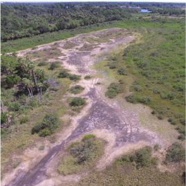 Salt pans can be sinuous landscape elements, covered with dark microbial mat, nested within the intertidal landscape. The perimeter of this salt pan in west-central peninsular Florida, presents a band of generally unmatted sandy soil, exemplifying structure in the distribution microbial mats. Drone photo by Bert Anderson.